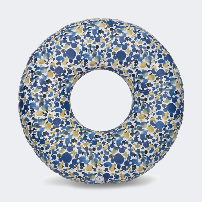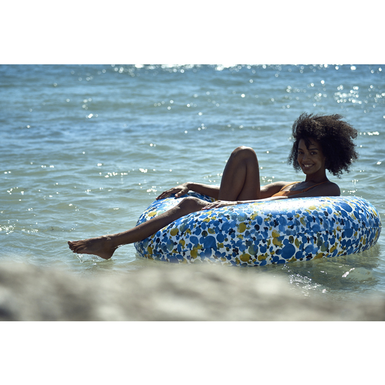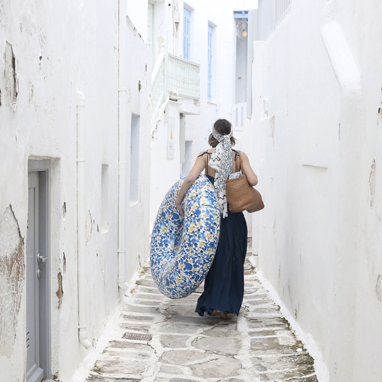 C’est exactement ce à quoi nous avons pensé en découvrant cette grande bouée imprimée aux reflets d’eau des criques de Formentera de la maison française The Nice Fleet…