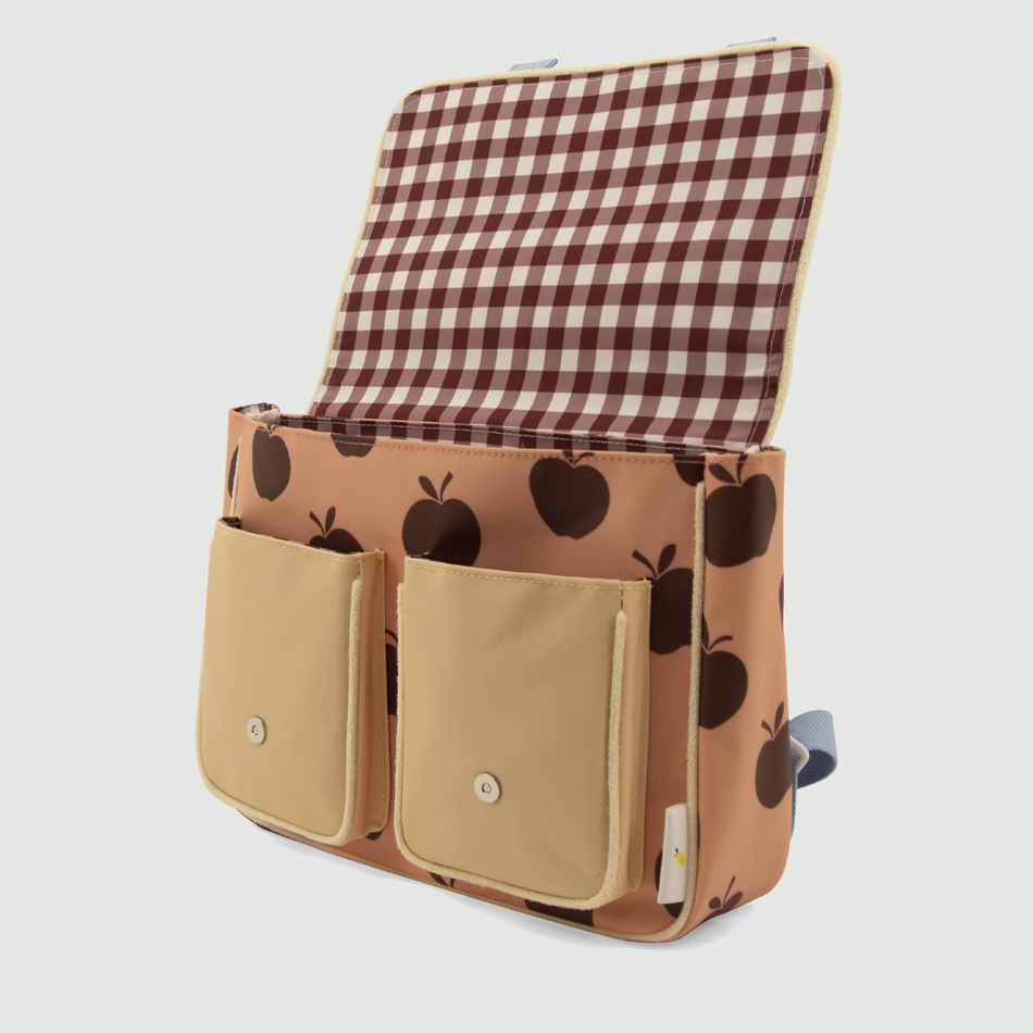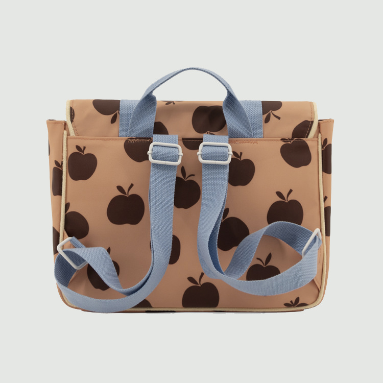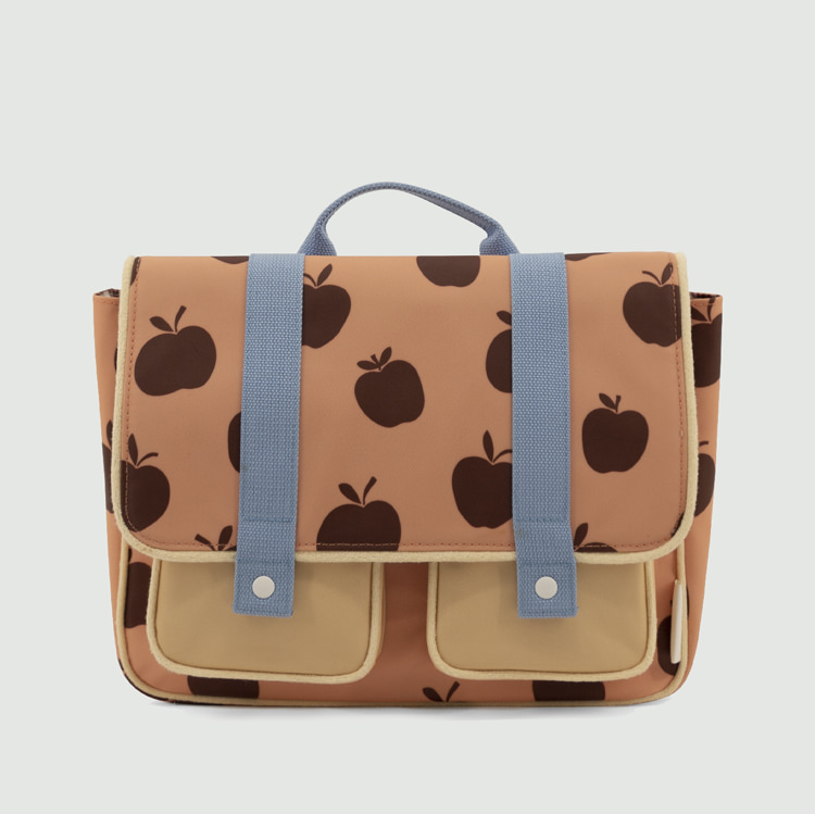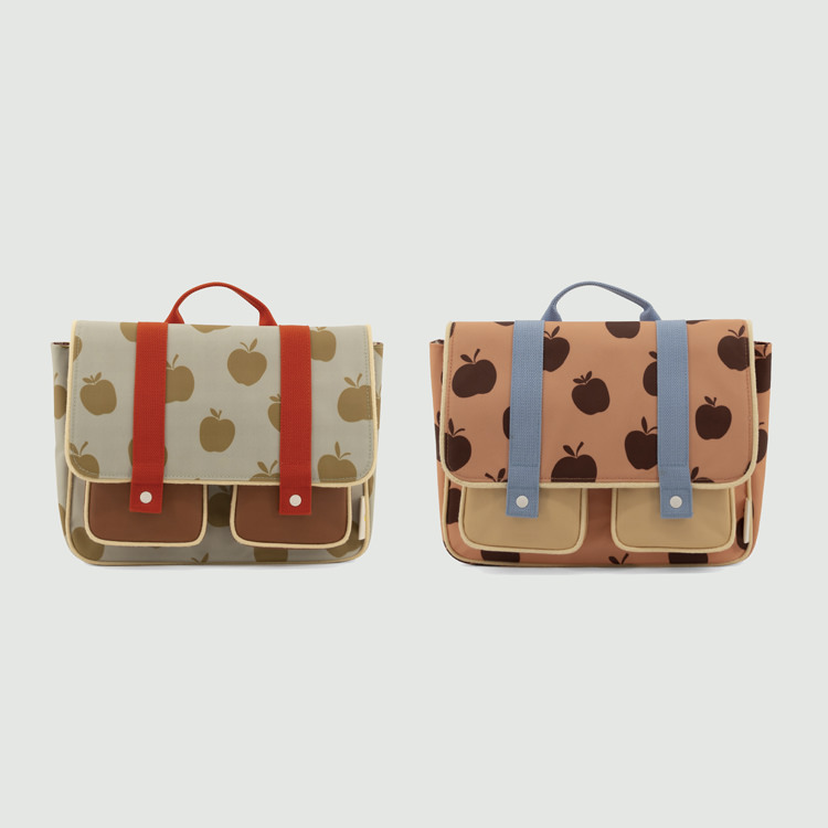 Les cartables de la collection Apples sont réalisés en coton waterproof (une simple éponge humide suffira à les nettoyer).