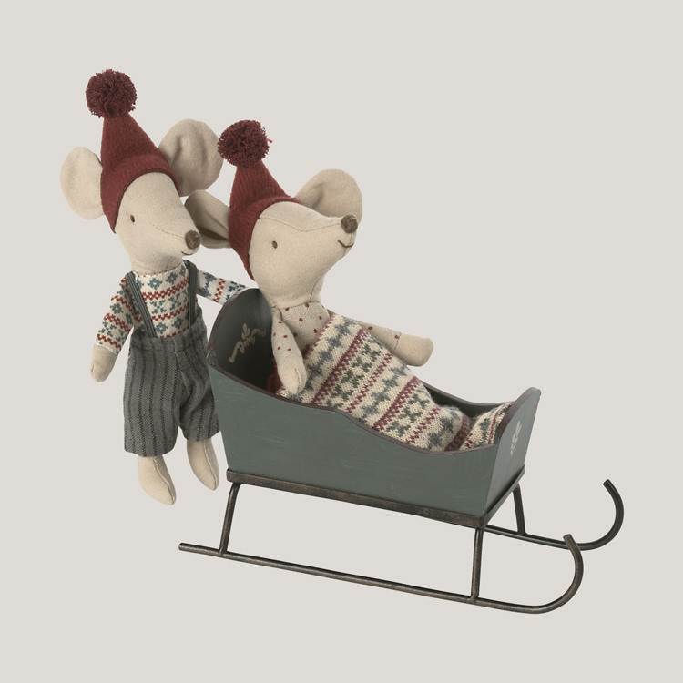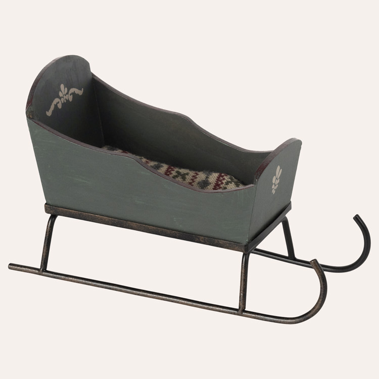 Lorsque je regarde ce petit traineau en bois de Maileg miniature, j’entends le des clochettes du Père Noël et “Jingle Bells” dans un coin de la tête!