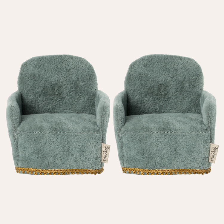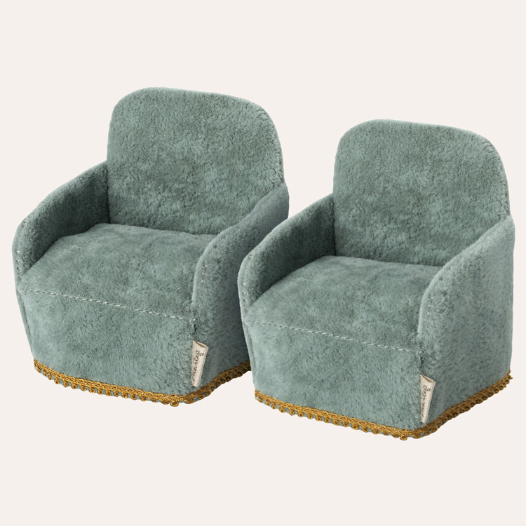 Ravissant petit ensemble de fauteuils cosy pour souris et maison de poupée Maileg, effet velours bleu vert. Ils seront parfait devant la cheminée de la maison en pain d’épices ou dans la grande ferme souris. Conçue pour les petites souris et lapins, cet ensemble complète la collection des accessoires miniatures que propose la marque danoise Maileg au fil des saisons.