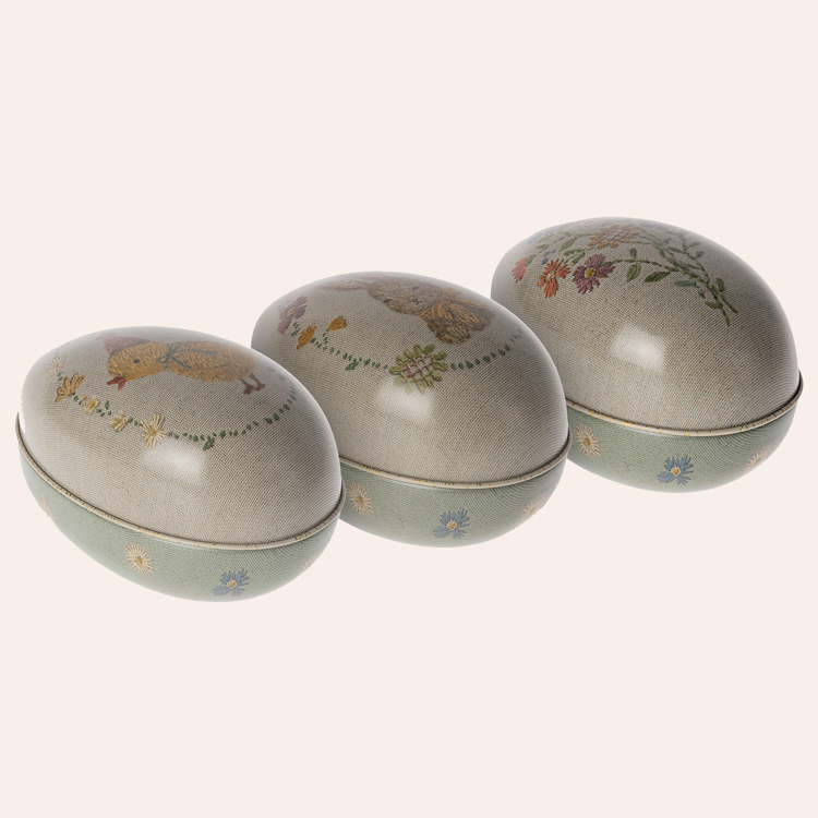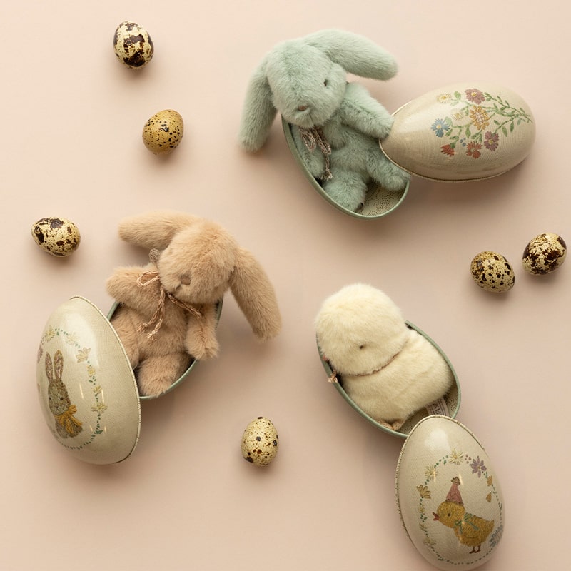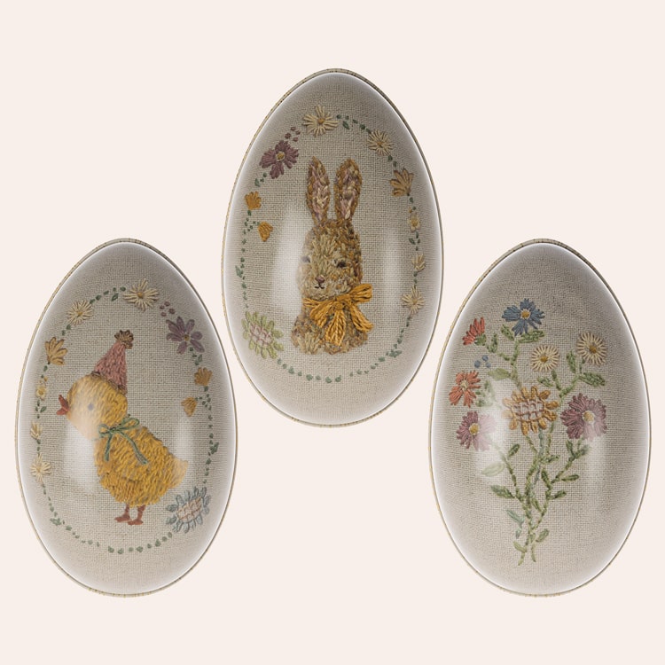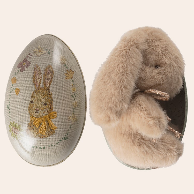 Maileg n’en finit plus d’enchanter nos saisons avec cette nouvelle collection d’oeufs à remplir. En métal peint, ce petit oeuf s’orne d’un joli motif de lapin brodé. A garnir de petites surprises comme notre adorable peluche mini lapin que ce soit pour la chasse aux oeufs de Pâques ou pour décorer votre table d’anniversaire ou de baptême.