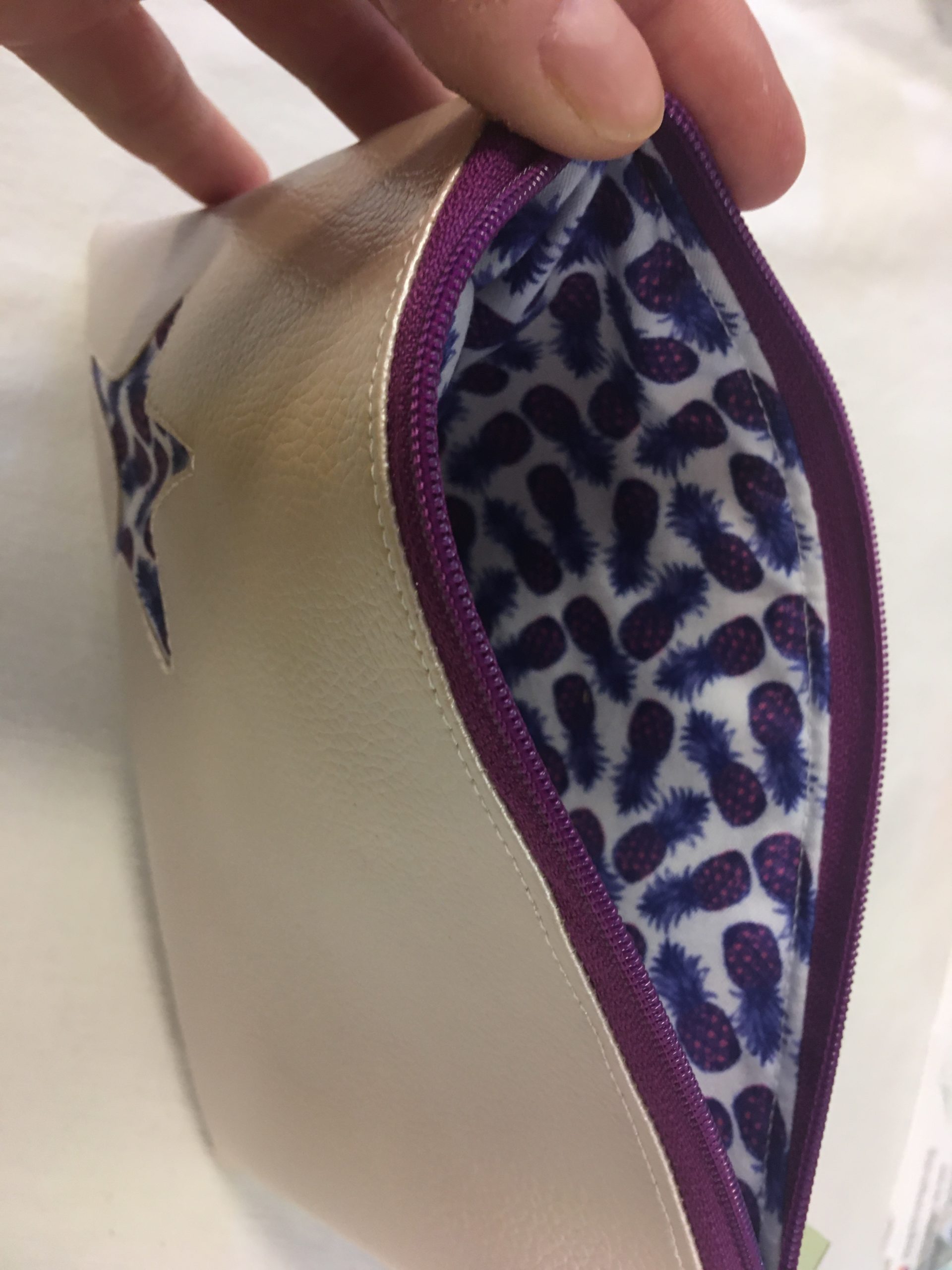 Cette pochette est constituée d’un simili cuir et une doublure imprimée ananas. Le tout fermé par une petite fermeture éclair.