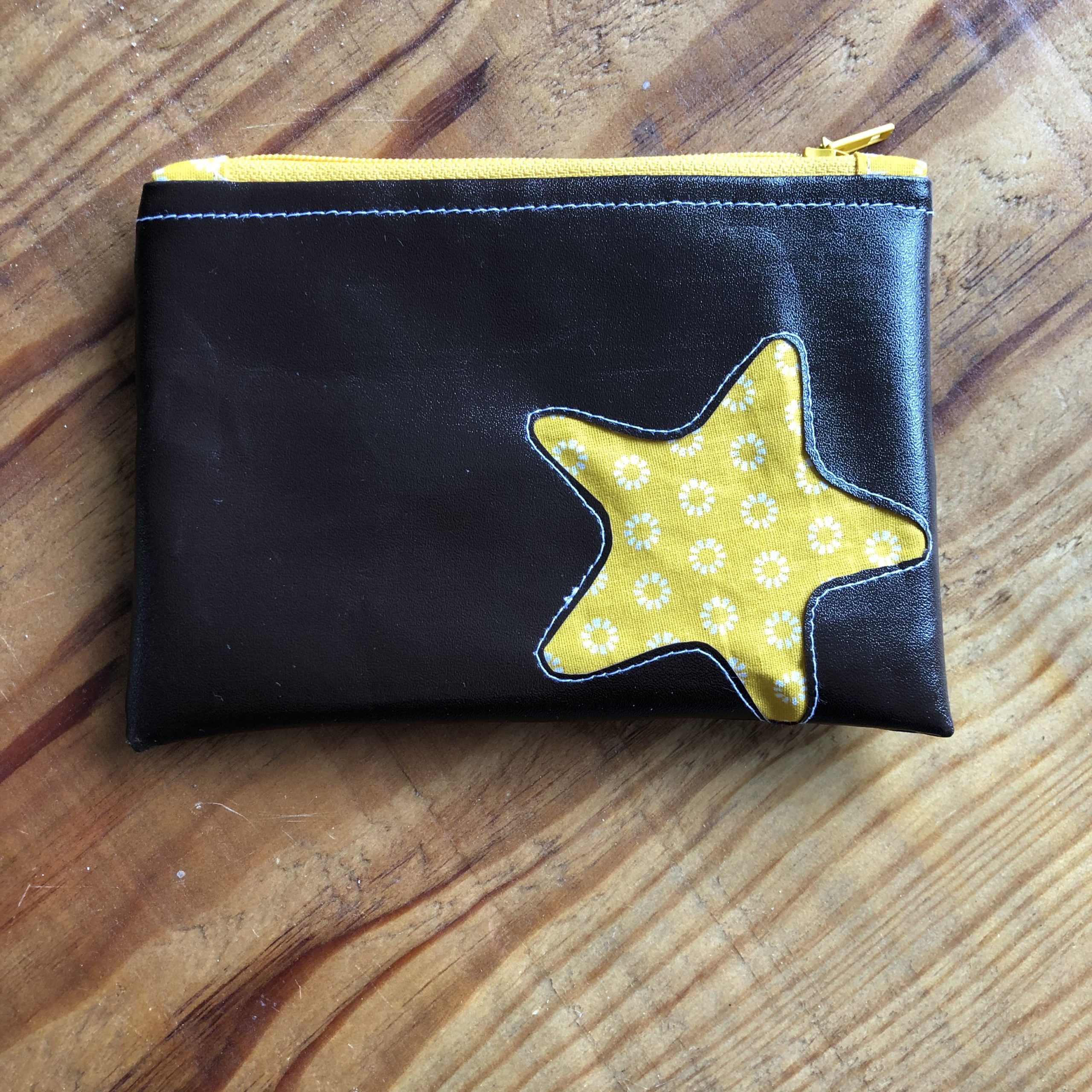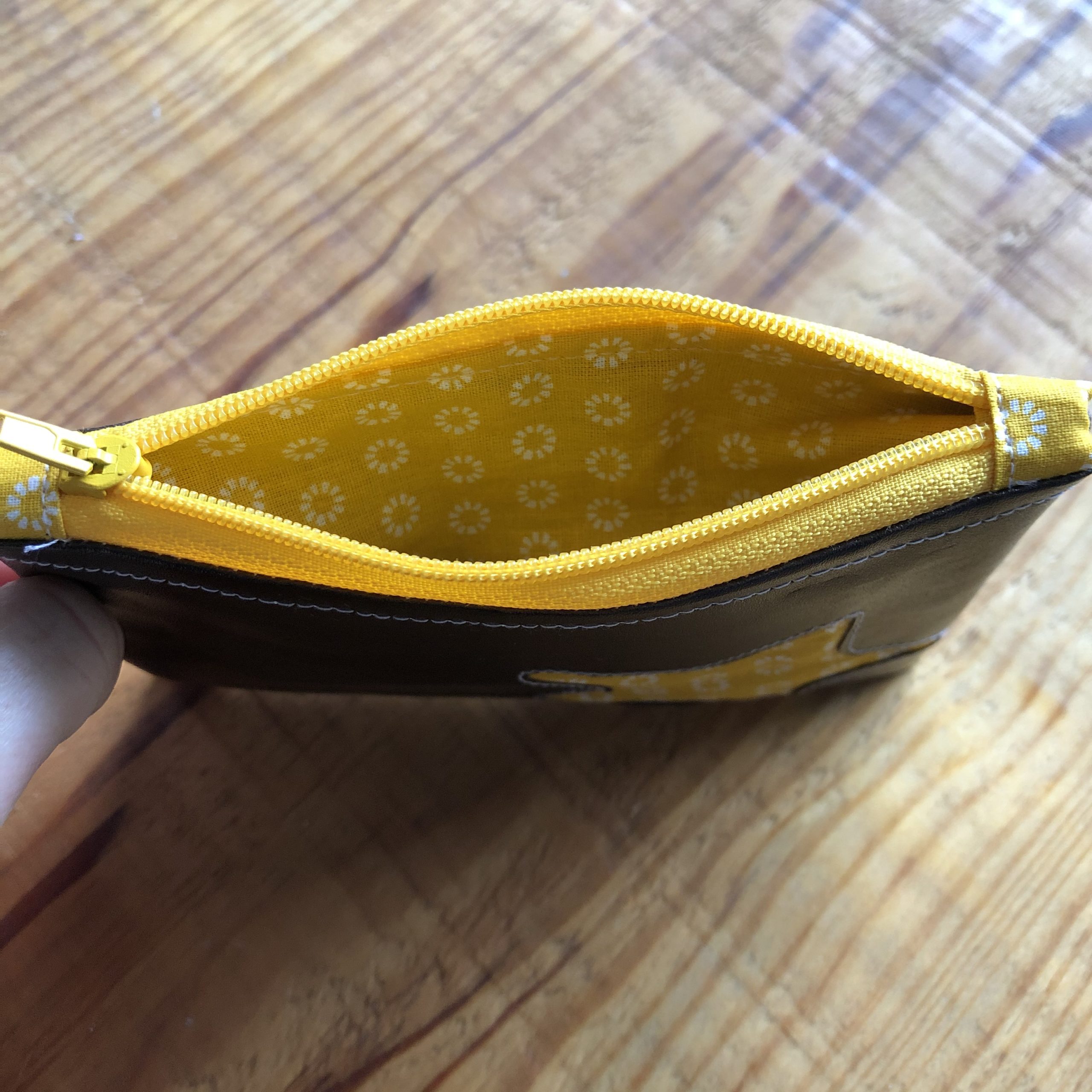 Ce porte monnaie est constitué d’un tissu en simili cuir et une doublure imprimée. Le tout fermé par une petite fermeture éclair.