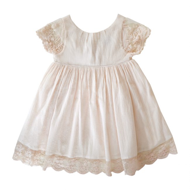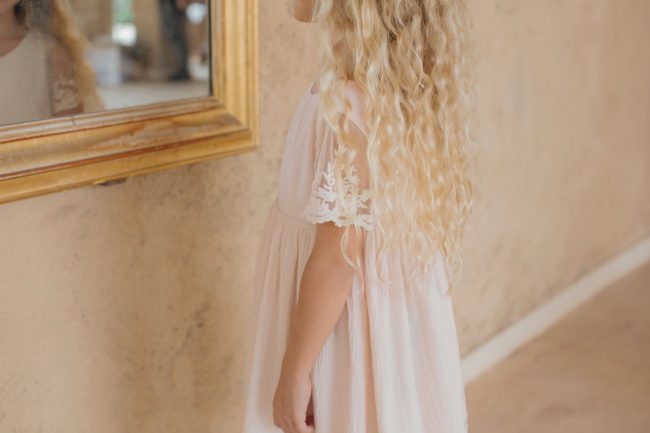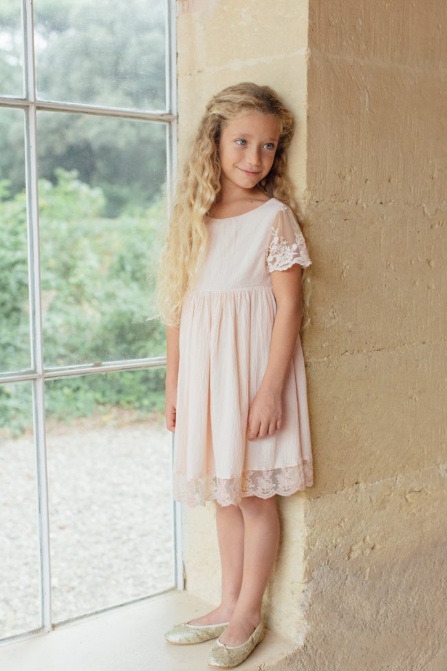La robe Manon imaginée par Les Petits Inclassables adopte un style résolument bohème grâce à la texture plissée du crêpe de coton et ses détails en dentelle brodée aux manches et au bas de la robe.