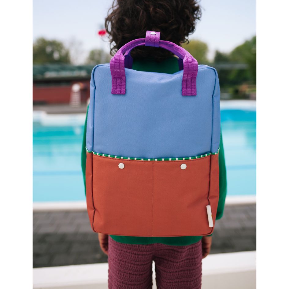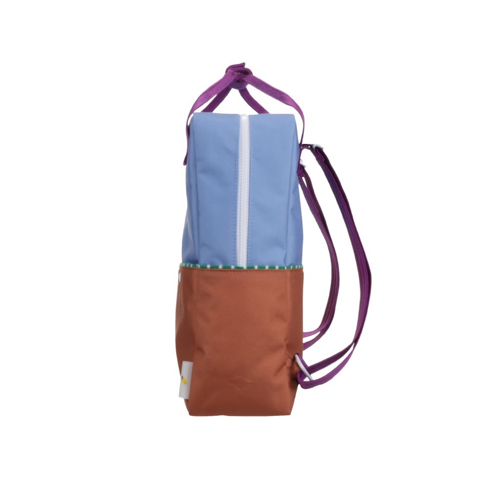 Détails : Tricolore (bleu doux, poignées et bretelles violet, marron), Bretelles réglables, zip YKK, Doublure imprimé fantaisie
