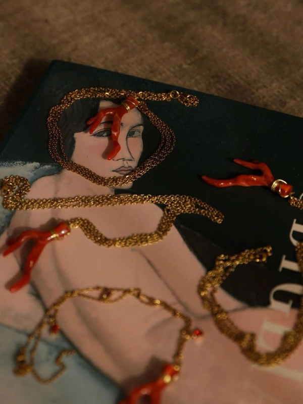 Collier sautoir composé d’une double chaîne dorée et orné d’un pendentif en forme de branche de corail rouge, maintenu par un fil métallique doré finement enroulé autour du haut du pendentif.